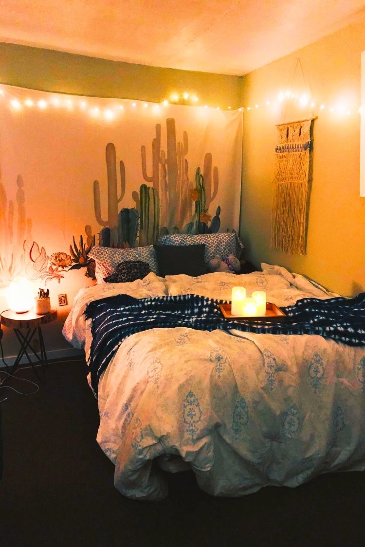 It’s funny that tacil admits their bedroom still smells faintly of paint and feet, but it visually feels cozy to me. Although it’s a college basement bedroom, it’s so thoughtfully decorated that it looks just like any other apartment. The cactus tapestry and macrame give it a warm, bohemian layer, while the fake candles add that moody glow without the fire hazard (literally a lifesaver in a basement).