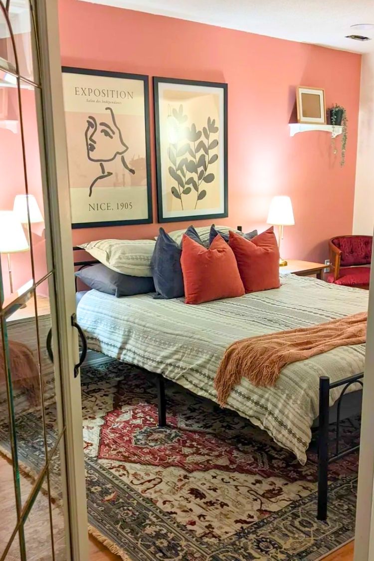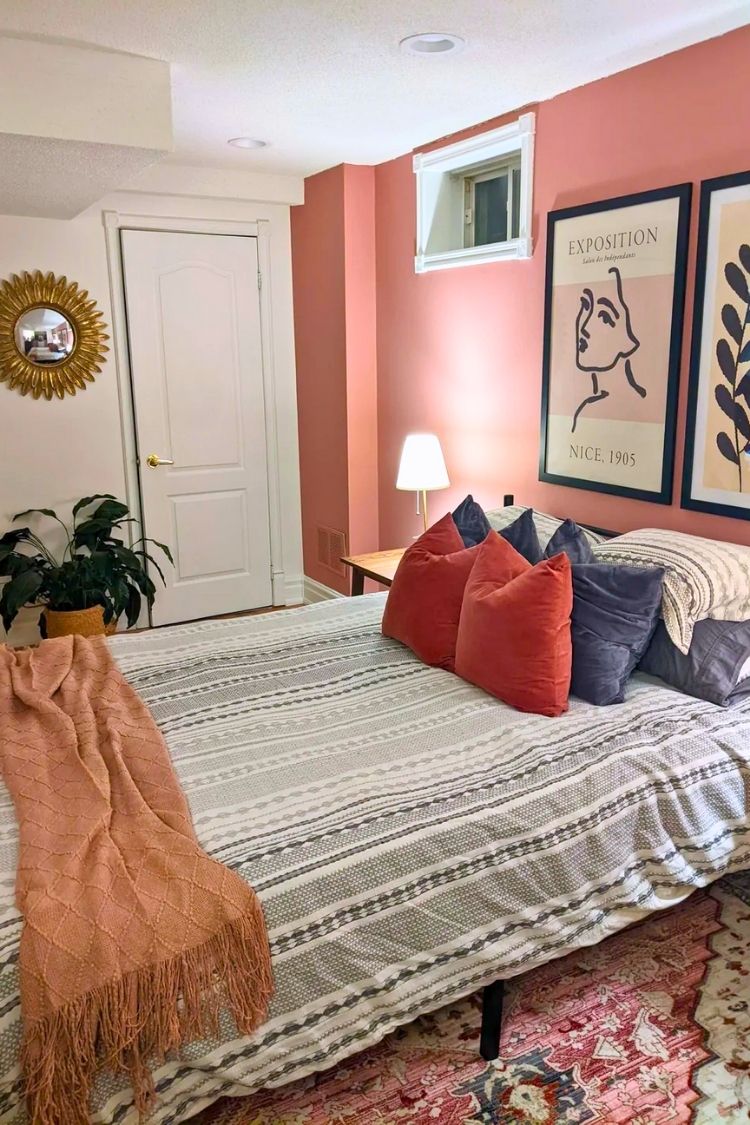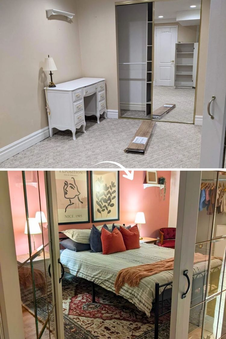No windows to work with, yet it feels bright, romantic, and so intentional. The dusty pink accent wall, cozy oak floors, and those French doors make it look anything but a basement.
