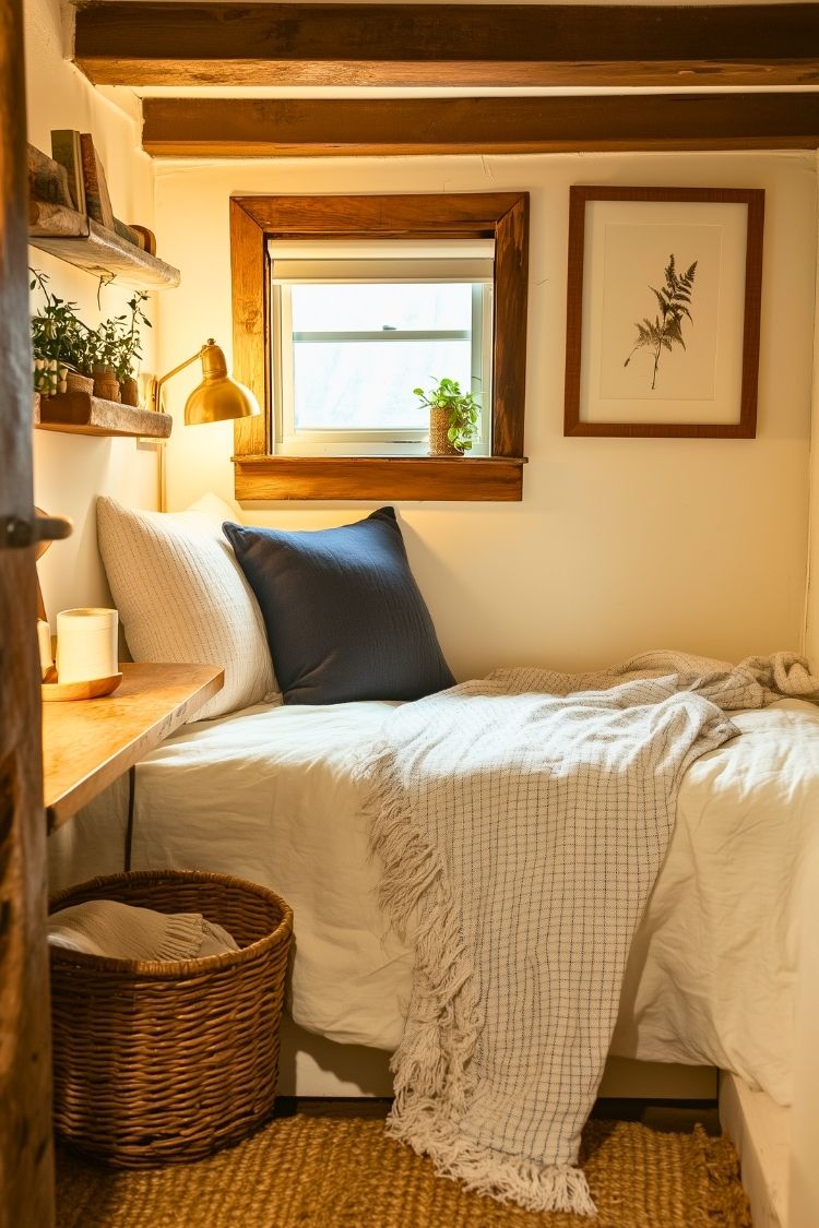 This small basement bedroom feels like a cozy hideaway thanks to warm wood accents, a golden lamp, and simple greenery on floating shelves.