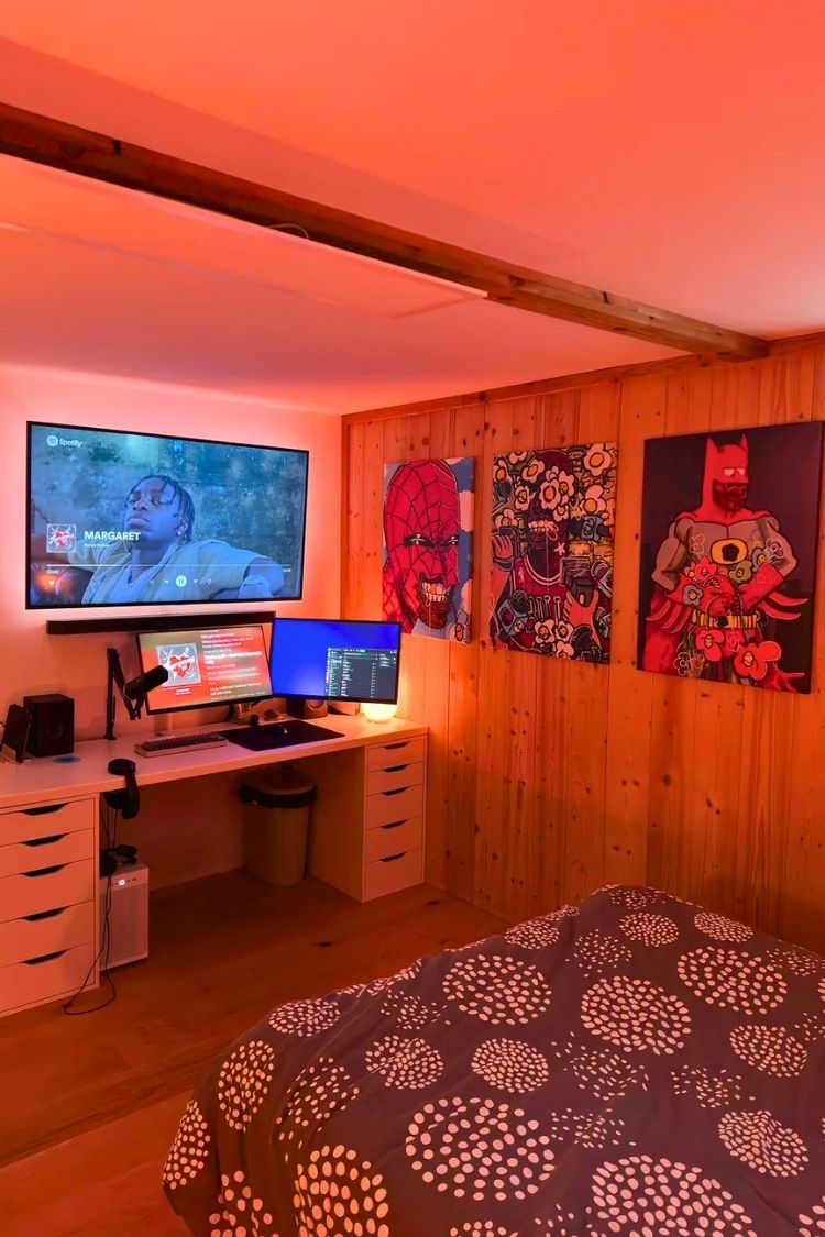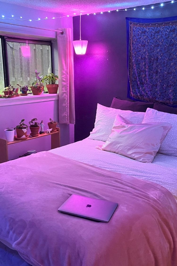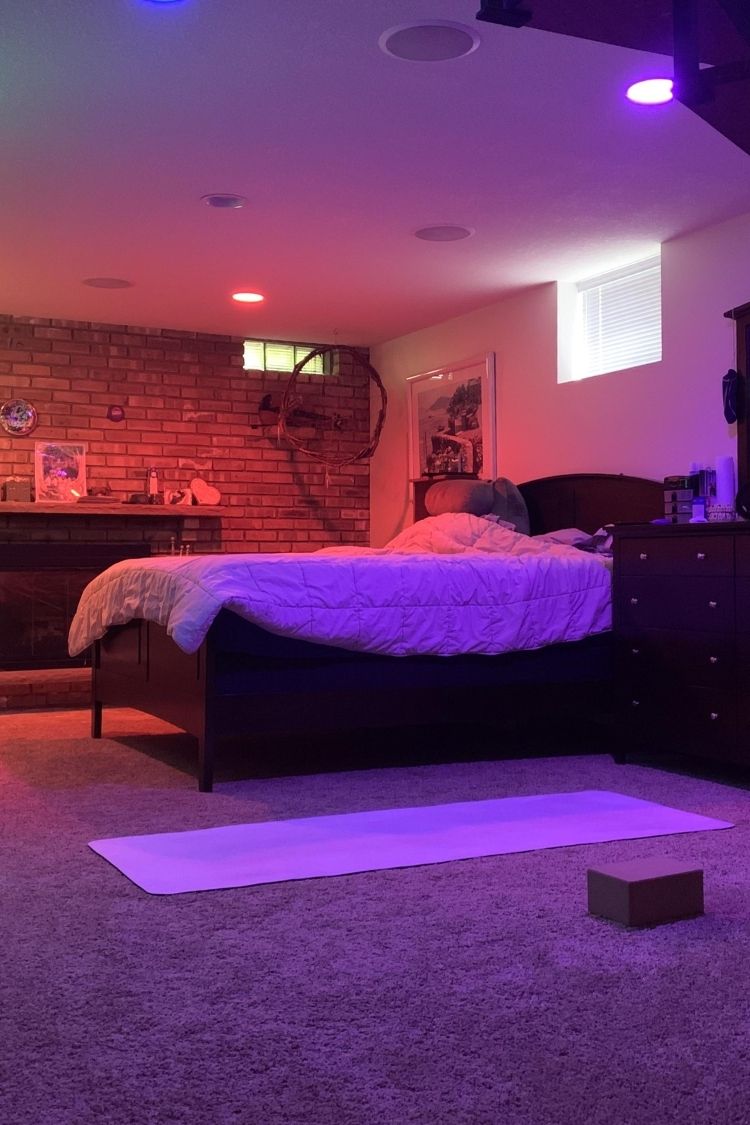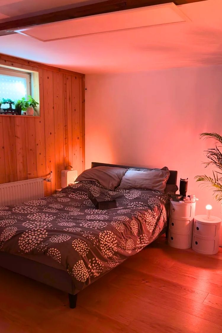 If you’re working with a basement or any dim space, focus on layered lighting and greenery. A simple Philips Hue bulb, string lights, and a few plants instantly soften the vibe. Obviously, this is a budget-friendly way to decorate your bedroom to make it much cozier. Like how badbloom did here.