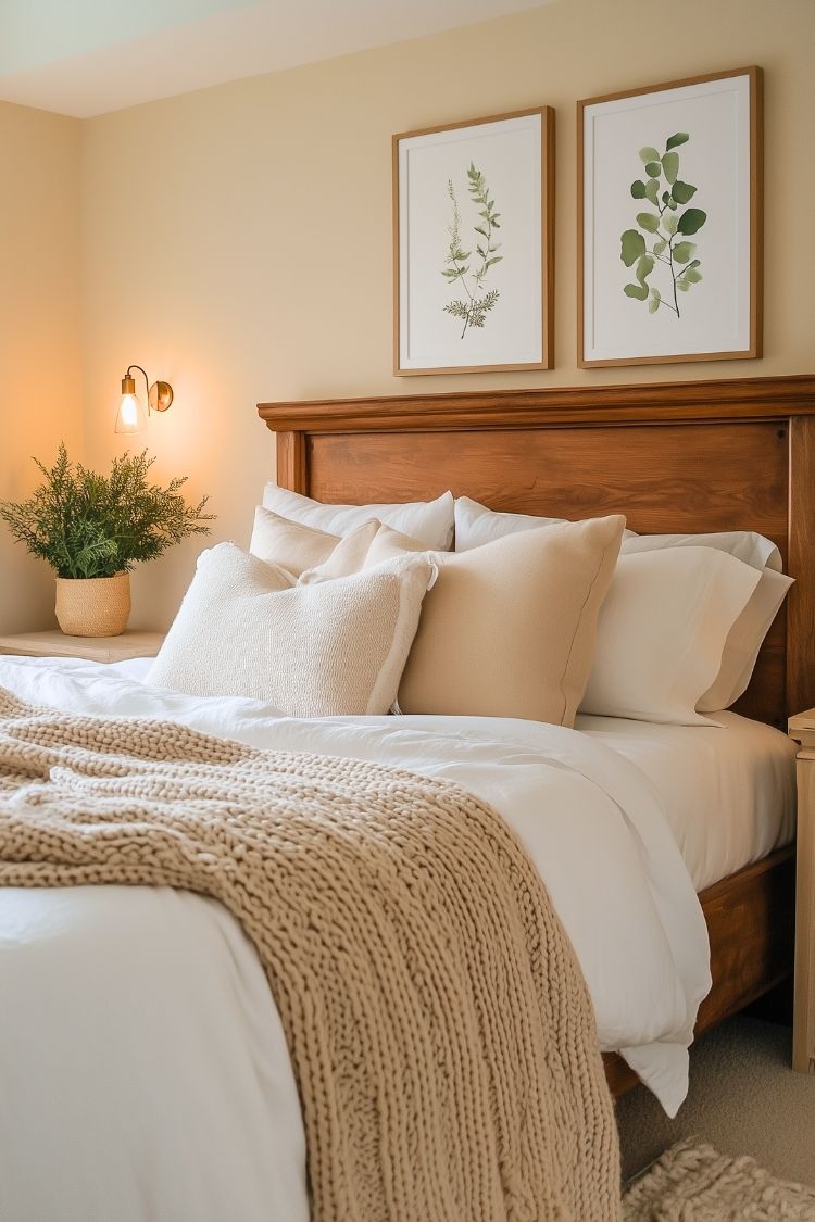 This neutral basement bedroom is a perfect example of basement bedroom ideas that feel stylish, calming, and effortlessly cozy. I love the way the wooden headboard and side table add natural warmth, while the pillows and blanket make it extra cozy.