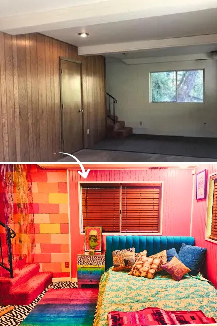 This basement guest room proves a budget DIY can still look bold. The brick wall, done entirely with leftover house paint, completely transforms the space, tying it to the rest of the home without spending extra. Add layered rugs, playful patterns, and a bead divider by the stairs, and the whole room feels like a quirky little retreat. Credit to u/rainbow_chaser86 for the transformation.