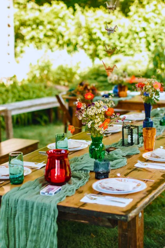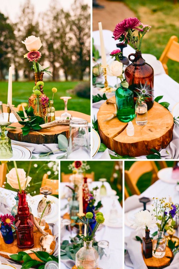 Held at her grandparents’ old log cabin, the setup was full of charm: colorful glassware, hand-painted placemats, and mason jars of local farm flowers.
