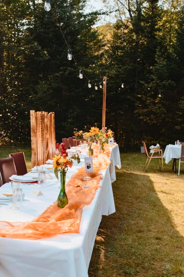 What I love most about u/joyfullyours’ $7K summer camp wedding is that warm orange palette, soft terracottas, golden tones, and muted peach everywhere you look. It made the whole scene glow against the fairy lights and wooden camp backdrop. She and her husband DIY’d nearly everything, from the table numbers to the chairs.