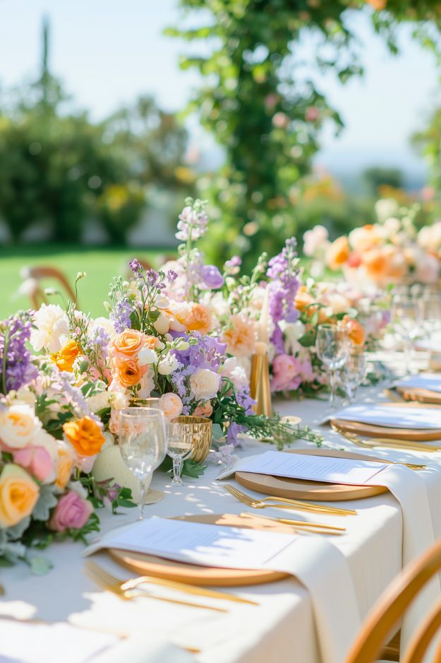 This tablescape might be one of the dreamiest takes on a spring palette I’ve seen, a mix of apricot roses, lilac blooms, and buttery yellow accents that glow under the sun. The gold-edged plates and soft linens keep it feeling refined but relaxed, like something out of a countryside garden party.