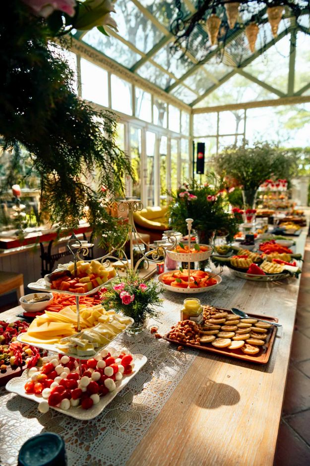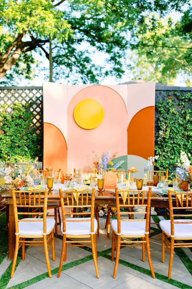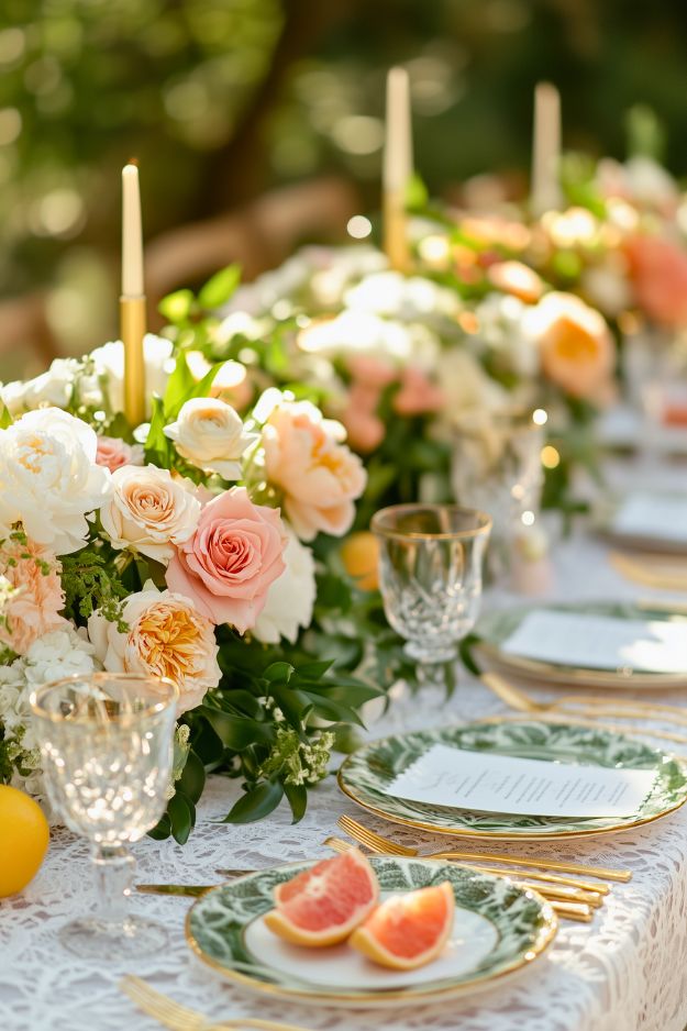 This one feels straight out of a vintage summer postcard — soft roses, lace tablecloths, and slices of grapefruit adding the prettiest pop of color. I’m obsessed with how the green patterned plates and gold cutlery give it that garden-party elegance without feeling overdone. But here’s the thing with fruit decor, it looks gorgeous but attracts flies fast. For outdoor setups, stick with citrus since it holds up better than pears or apples, which brown quickly in the heat.