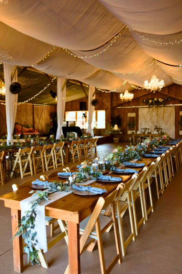 I love how special and natural everything looks here — the kind of setup that feels effortless but clearly had so much thought behind it. The barn setting turns simple into spectacular with those draped ceilings and glowing string lights, instantly softening the space. By emilinethestar