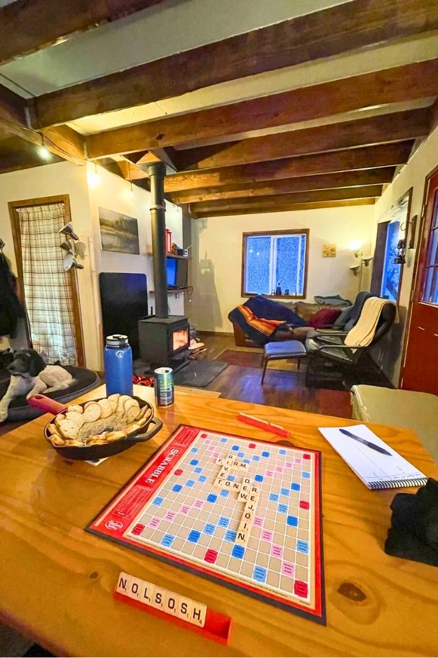This setup makes those 18-hour nights feel almost inviting. The cabin glow, the wood stove cranked to 80, a Scrabble board on the table, and a pan of bread with crab dip, it all comes together in that lived-in, nothing-fancy way that feels deeply comforting.