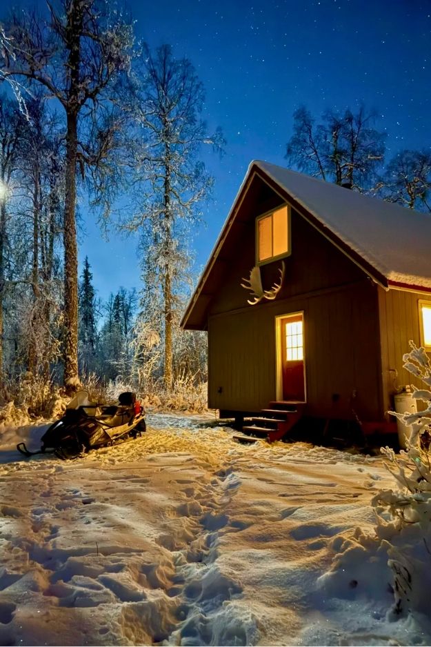 I love that it’s just an off-grid Alaskan cabin doing its thing, no staging needed, with “Good boy floofus” guarding the door like he owns the place.