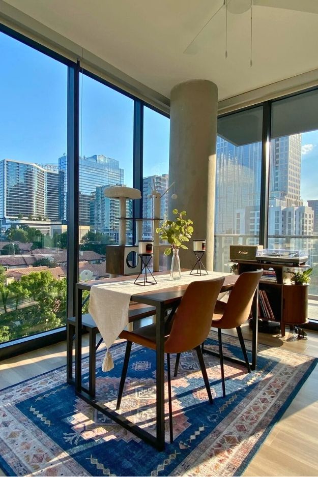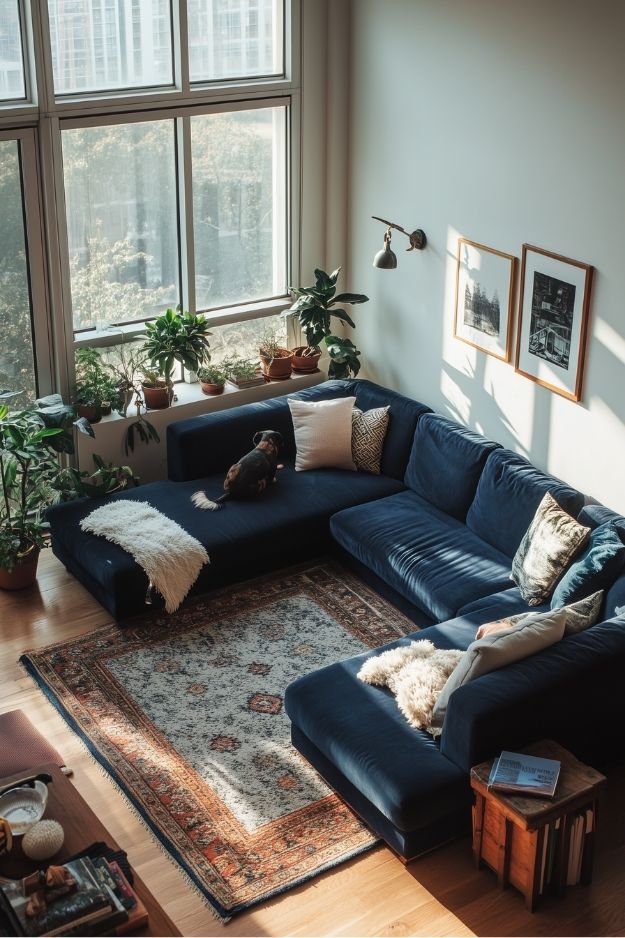 This apartment is the kind of place that I’d never want to leave. The deep blue sectional is definitely the main object of the whole space. It’s bold but still cozy, especially paired with that vintage-style rug on the floor. This sofa can even turn into a comfy bed at night, and you can save the budget for other things. I especially love the big window; it’s modern yet inviting, with just the right mix of color, comfort, and personality.