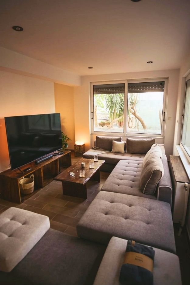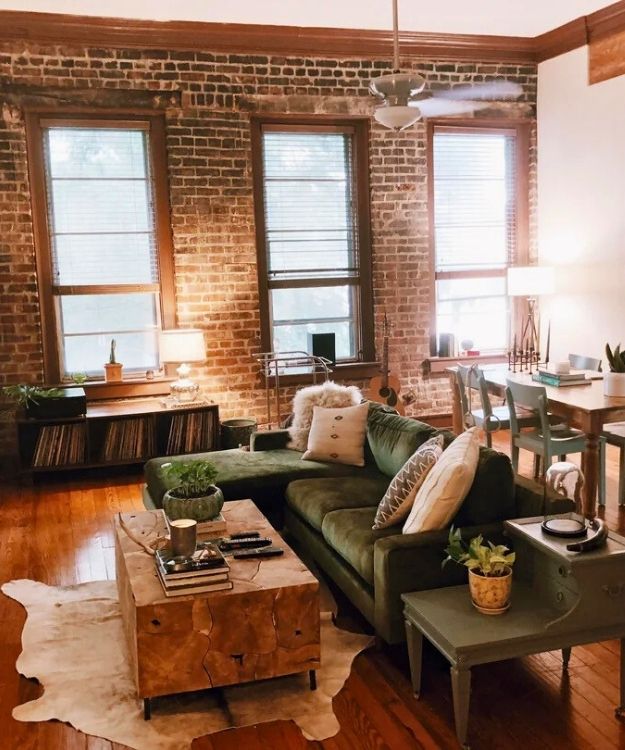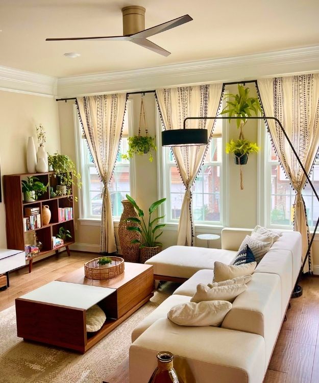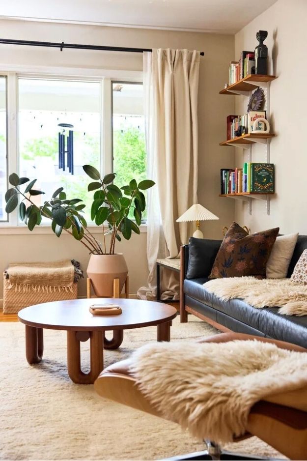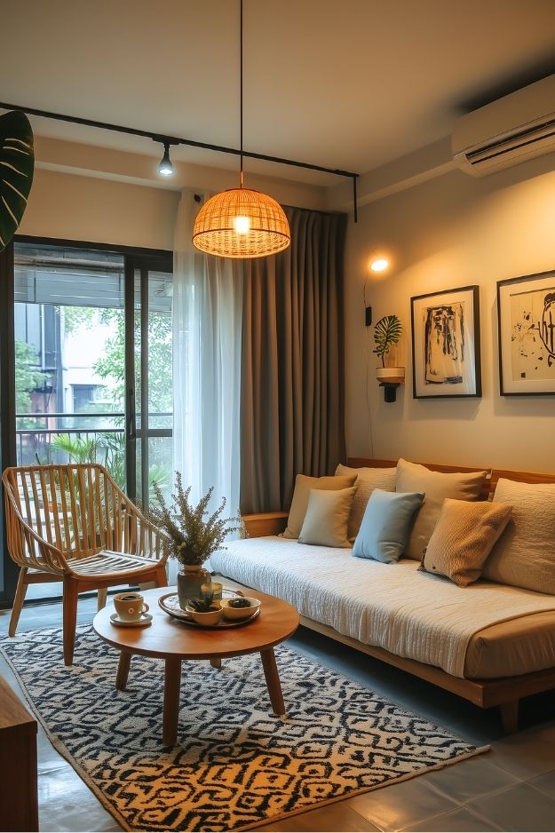 If you want your apartment to look a bit old-fashioned and mature, you can find inspiration from this one. It’s a full combo of mid-century wood tones and creamy textiles without being heavy. The patterned rug anchors everything. It has just enough color and depth while still keeping the palette earthy and cohesive. It looks minimalist and budget-friendly for someone first moving out.