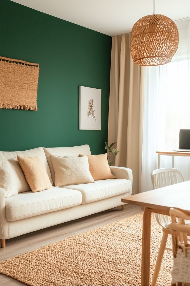 What I really like about this apartment is how the green wall pops up as a highlight for the whole space. The beige sofa and neutral pillows tie everything together. One helpful tip for anyone living alone for the first time: stick to just two main colors for your apartment. It keeps the space looking cohesive and stylish without feeling cluttered or overwhelming.